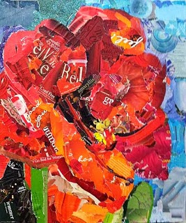 24x20 WIP (work in progress) continues with the background blues added today and other touch ups for about 2 hours time. I'm not sure the large dark green leaf lower left is light enough. On the monitor it appears too dark value, almost black. But in real life it isn't. More yellow was added for stamens that were tiny lemons in the photo I tore up. I still think Santa is a nice touch along with a torn word Believe. Go Red for Woman phrase is also put at lower left of its red petal. The other bloom behind it hopefully is not competing for attention. So stay tuned and you may see its finish tomorrow or the next day; tomorrow are three Christmas parties, two at work and the third is our Big Spring Art Association.